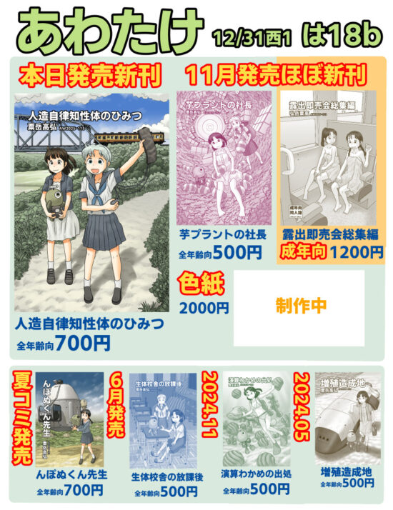 冬コミのおしながき 冬コミ(C107)のおしながきです 水曜日西1ホール・は18b・あわたけ で参加します 📖当日発売の新刊は「人造自律知性体のひみつ」 A5/30p/漫画24p/全年齢向📖11月コミティアのほぼ新刊が2種。その他既刊や色紙をおいている予定です(゚∀゚) https://webcatalog-free.circle.ms/Circle/22025150 共有:シェア クリックして X で共有 (新しいウィンドウで開きます) X Facebook で共有するにはクリックしてください (新しいウィンドウで開きます) Facebook クリックして Tumblr で共有 (新しいウィンドウで開きます) Tumblr いいね:いいね 読み込み中… 関連